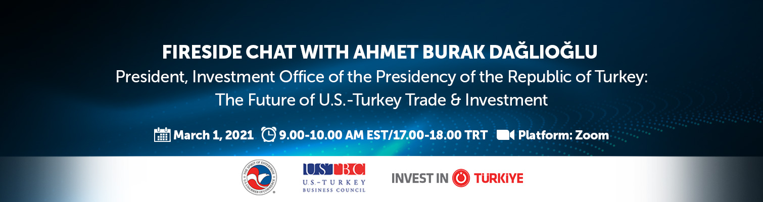 Join us for a fireside chat with Ahmet Burak Dağlıoğlu, President of the Investment Office of the Presidency of the Republic of Türkiye and Khush Choksy, Senior Vice President, Middle East, Türkiye and Kazakhstan Affairs at the US Chamber of Commerce on the investment and trade outlook for US-Türkiye relations in 2021.