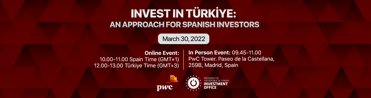 Investment Office of the Presidency of the Republic of Türkiye and PwC will jointly host the “Invest in Türkiye: An Approach for Spanish Investors” hybrid event to shed light on available industry opportunities, investment protection framework, incentives for business development, and the tax treatment of Spanish investors.
