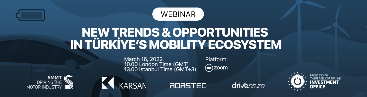 Investment Office of the Presidency of the Republic of Türkiye and the Society of Motor Manufacturers and Traders (SMMT) are delighted to host the “New Trends & Opportunities in Türkiye’s Mobility Ecosystem” webinar as part of SMMTElectrified International webinars to share about the new mobility opportunities for UK automotive businesses.