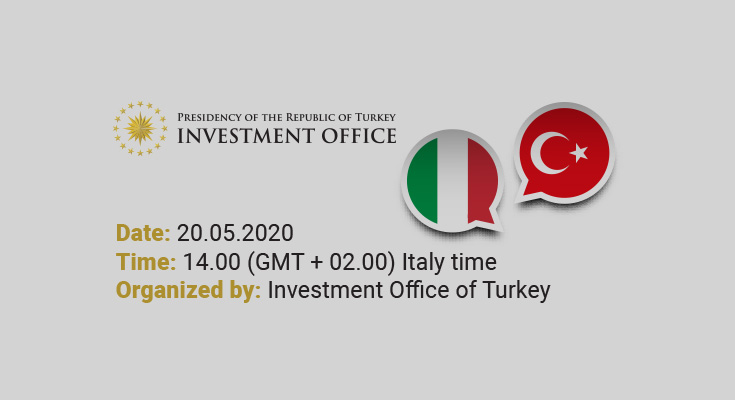 On May 20, 2020 at 14.00 (GMT + 02.00) Italy time | 15.00 (GMT + 03.00) Türkiye time, the Investment Office of the Presidency of the Republic of Türkiye will hold a webinar for the Italian business community to provide in-depth information during these challenging times.